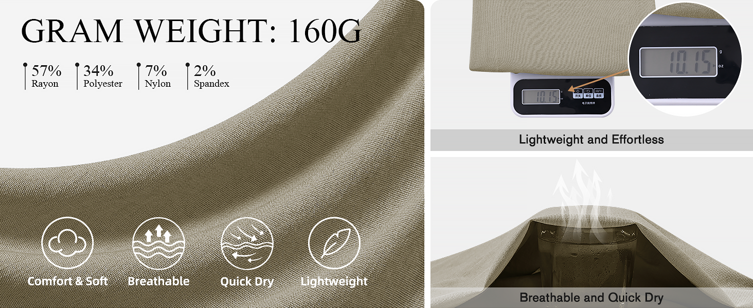 Fabric Type: Material: 57% Rayon, 34% Polyester, 7% Nylon, 2% Spandex, lightweight, quick-drying, skin-friendly, moisture-wicking, comfortable and breathable, soft and comfortable.