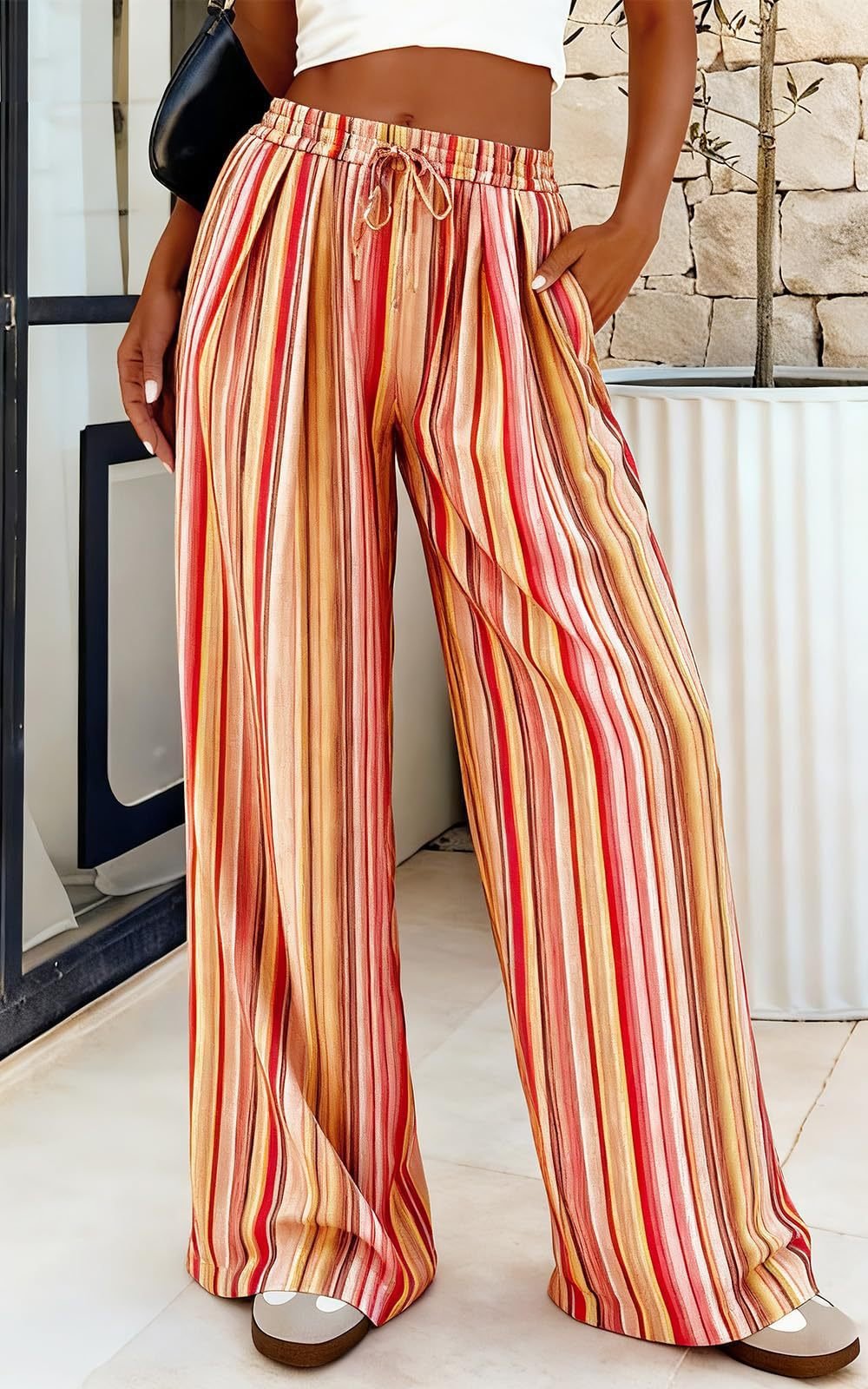 Petite-friendly, ultra-soft striped palazzo trousers—blending all-day comfort with practical design, perfect for casual daily wear and lounge!