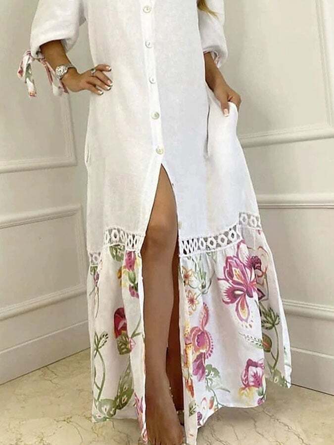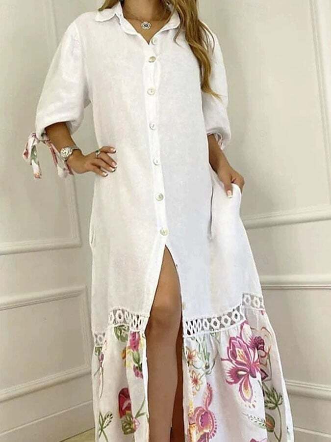 Women's Casual Floral Printed Paneled 3/4 Sleeve Shirt Dress