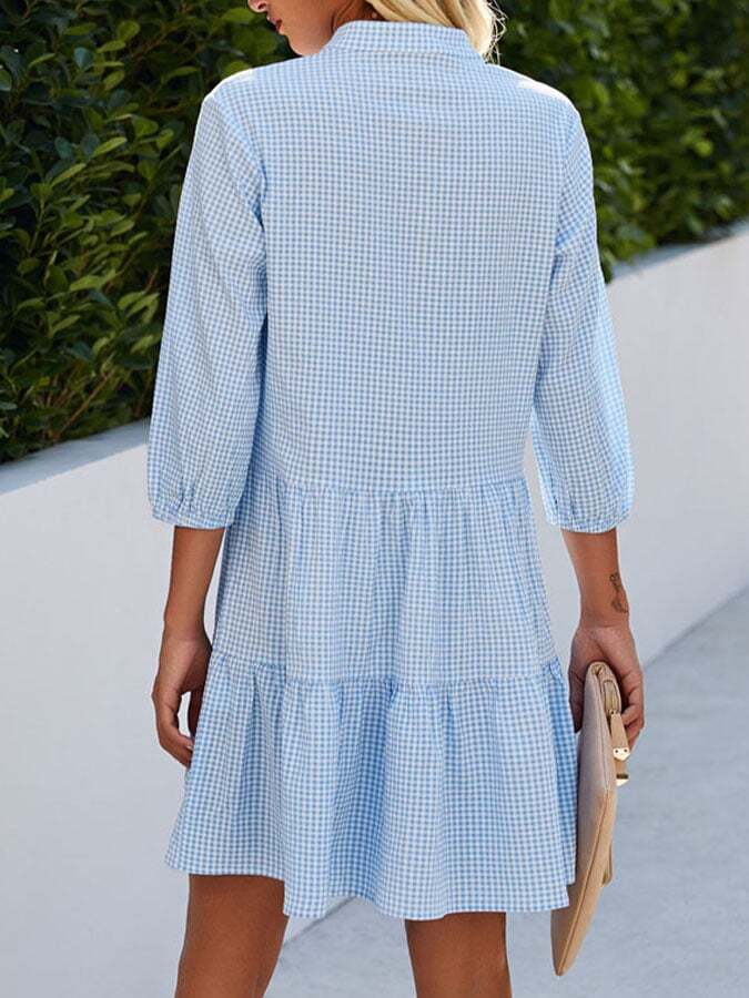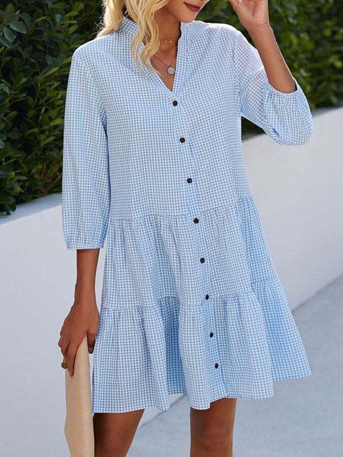 Women'S Casual Plaid Print V-Neck Three-Quarter Sleeve Shirt Dress